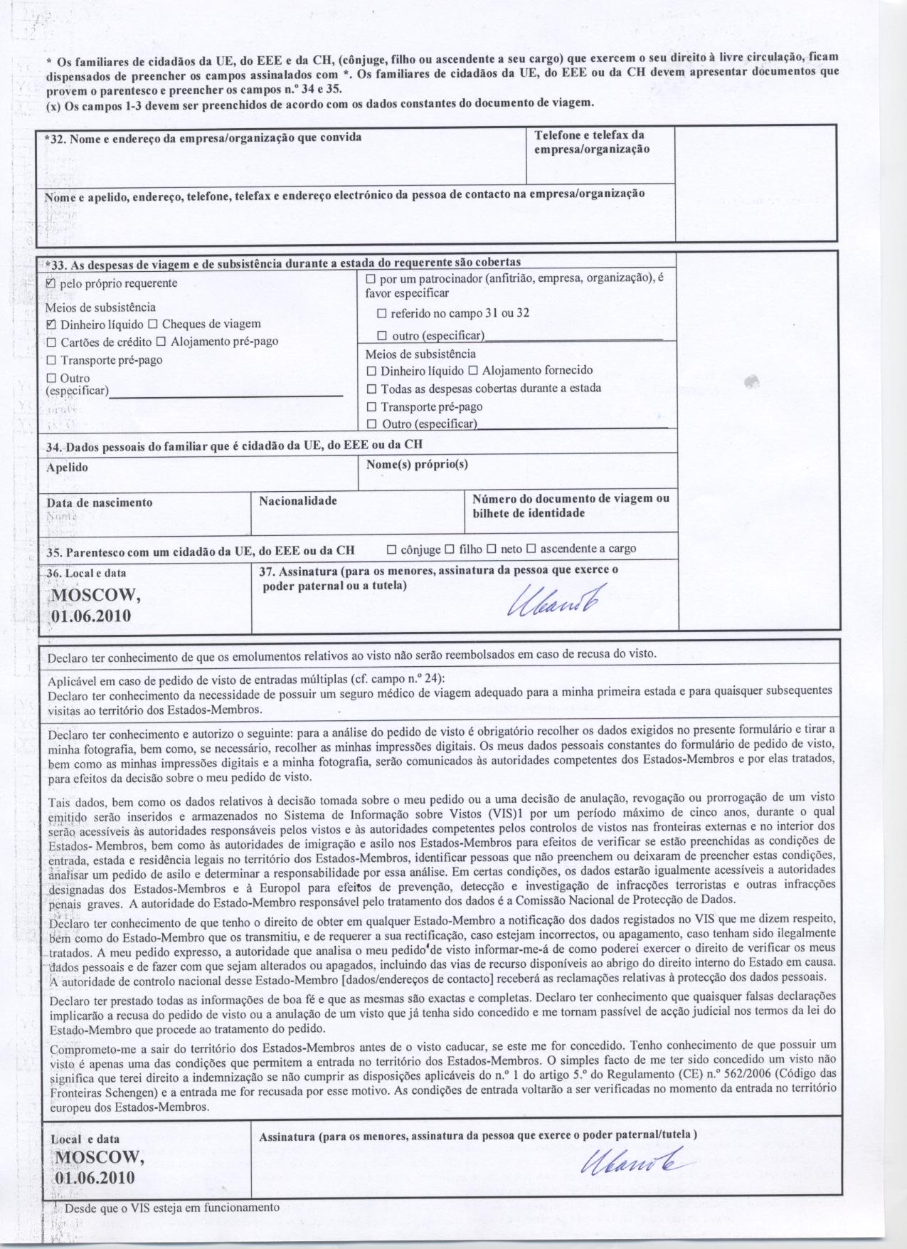 Заполнить опросный лист и вторую страницу анкеты (4 экземпляра) с оригинальной подписью заявителя в 37 пункте (проставьте «город» и «дату» в поле 36) и в такие же поле внизу анкеты. За несовершеннолетнего ребенка расписываются оба родителя.
